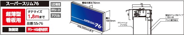 LED専用フレーム スーパースリム76 品名:D76 スーパースリム76 超薄型FFバックライトフレーム FF使用の時防水タイプ 背面は強靭なアルミ箱型パネルです。 バックライト光源にはLEDチャンネルライト・LED DCライト等を使用。光拡散で均一な明るい表示面が得られます。 IJP出力に最適なFFシートです。